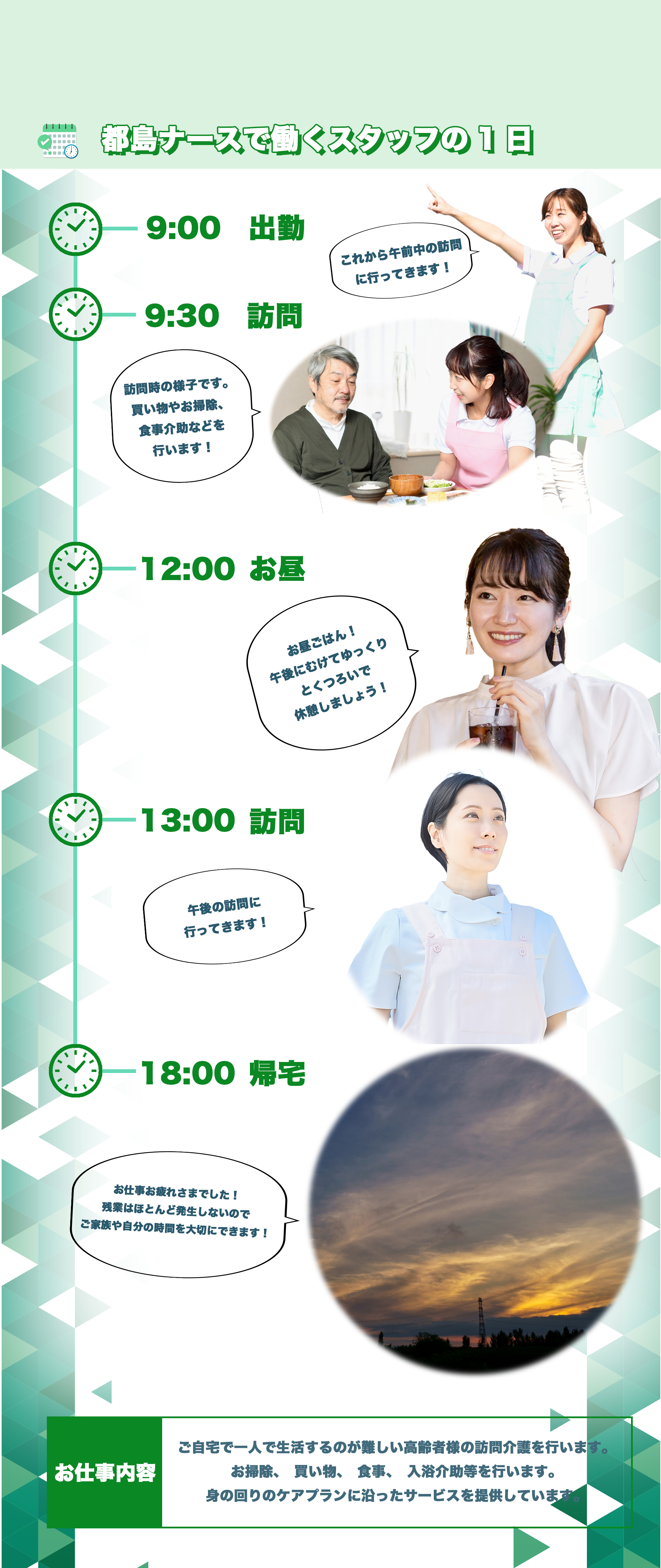 | 仕事内容 | ご自宅で一人で生活するのが難しい高齢者様の訪問介護を行います。 お掃除、買い物、食事、入浴介助等を行います。 身の回りのケアプランに沿ったサービスを提供し ています。 |